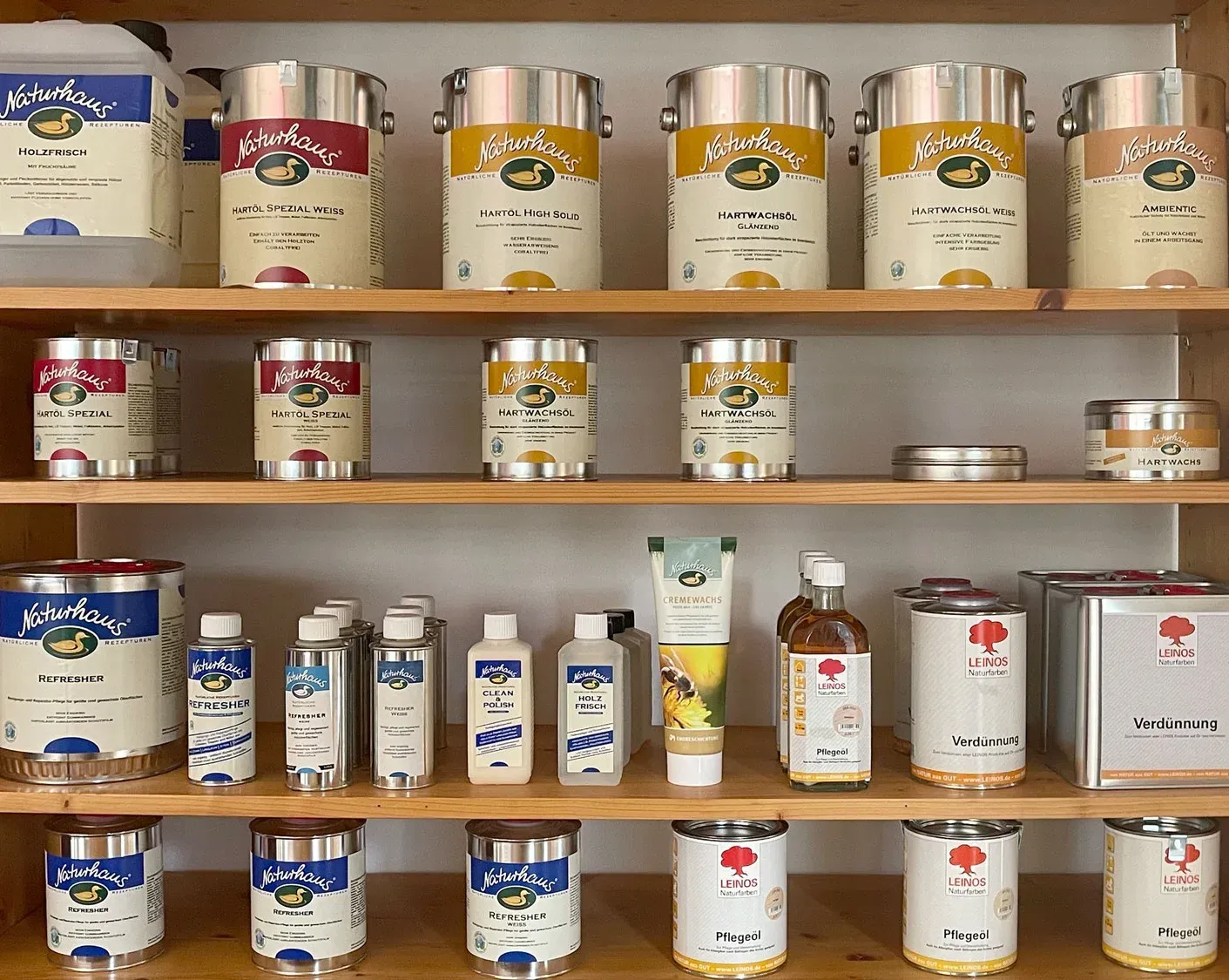 Wir sind der Naturfarbenfachhändler in Essen bei dem Sie das größte Lagersortiment an Ölen, Wachsen, Lasuren, Wandfarben und Kalkfarben der Firmen Naturhaus, Leinos und Haga zur Gestaltung und Pflege Ihrer Möbel, Wände, Fußböden, sowie Holzschutzprodukte für Holz in Außenbereich finden.